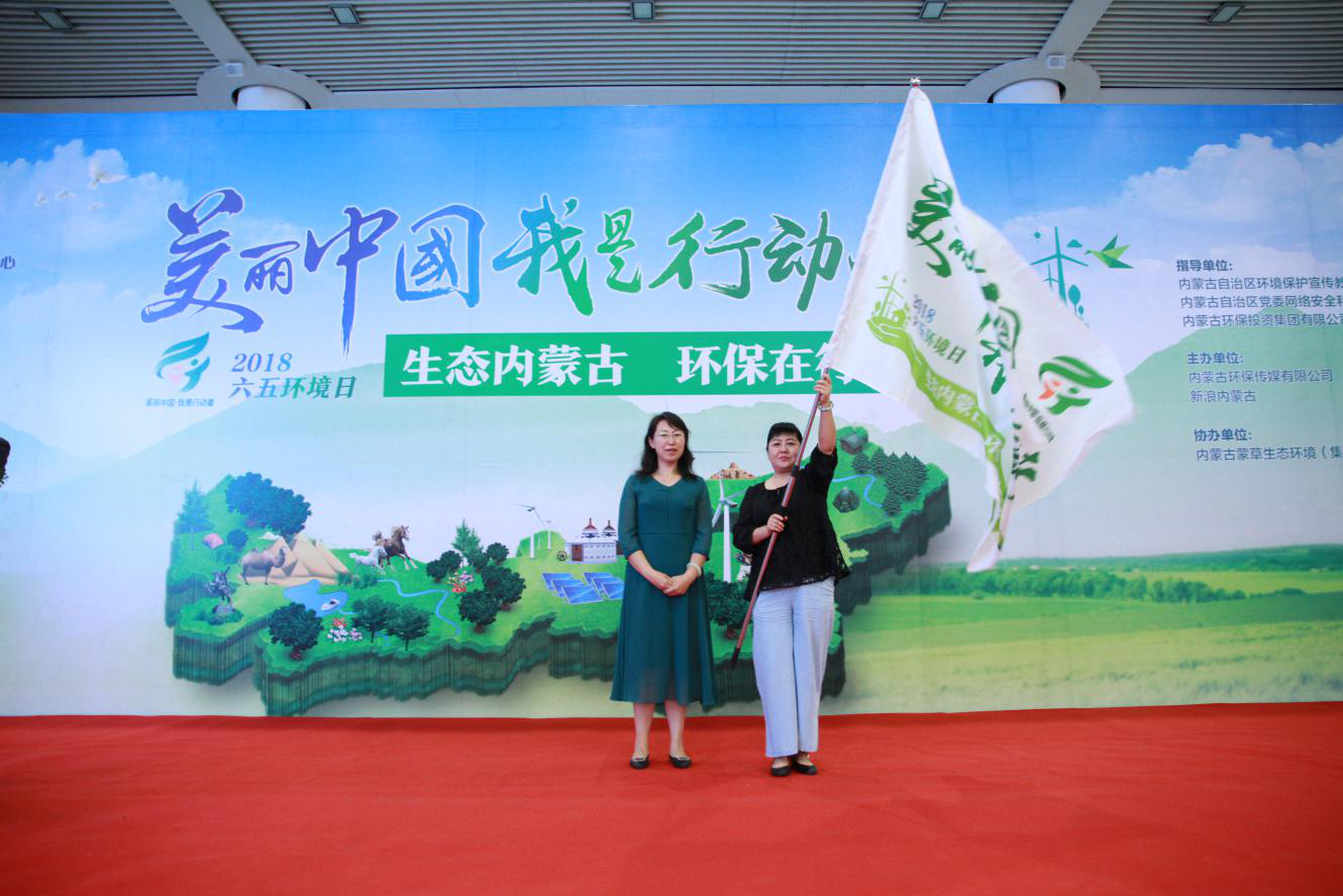 内蒙古自治区党委网络安全和信息化领导小组办公室网评处副处长艺兰娜向网络名人代表何凌授旗,启动#生态内蒙古 环保在行动#网络名人行活动。